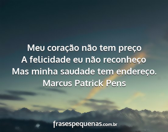 Meu coração não tem preçoA felicidade eu não reconheçoMas minha saudade tem endereço.Marcus Patrick Pens