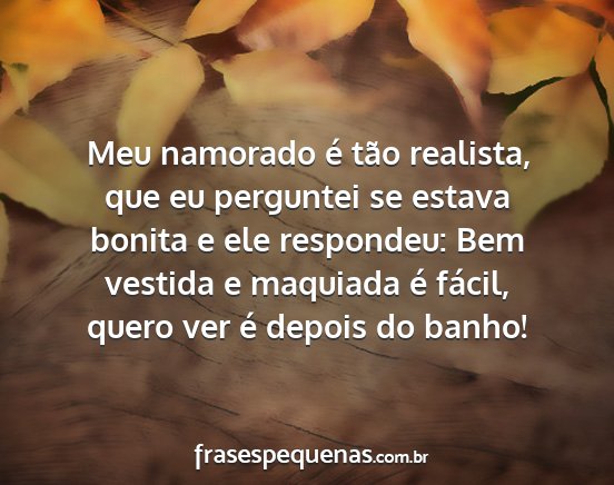 Meu namorado é tão realista, que eu perguntei se estava bonita e ele respondeu: Bem vestida e maquiada é fácil, quero ver é depois do banho!