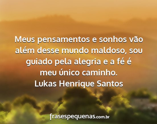 Meus pensamentos e sonhos vão além desse mundo maldoso, sou guiado pela alegria e a fé é meu único caminho.Lukas Henrique Santos