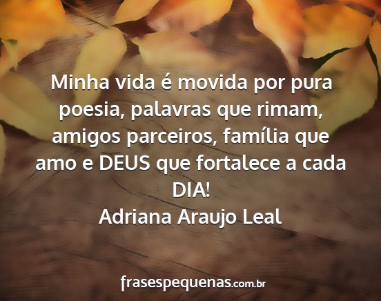 Minha vida é movida por pura poesia, palavras que rimam, amigos parceiros, família que amo e DEUS que fortalece a cada DIA!Adriana Araujo Leal