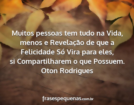 Muitos pessoas tem tudo na Vida, menos e Revelação de que a Felicidade Só Vira para eles, si Compartilharem o que Possuem.Oton Rodrigues