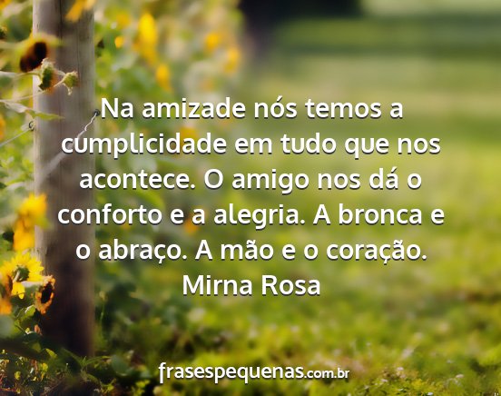 Na amizade nós temos a cumplicidade em tudo que nos acontece. O amigo nos dá o conforto e a alegria. A bronca e o abraço. A mão e o coração.Mirna Rosa