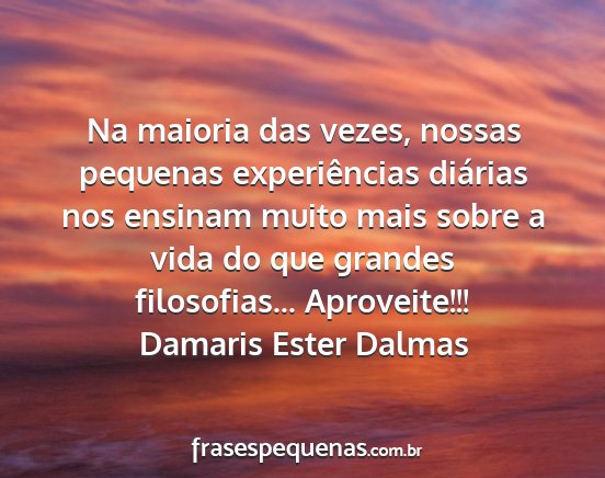 Na maioria das vezes, nossas pequenas experiências diárias nos ensinam muito mais sobre a vida do que grandes filosofias... Aproveite!!!Damaris Ester Dalmas