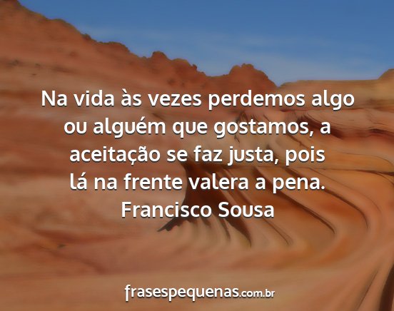 Na vida às vezes perdemos algo ou alguém que gostamos, a aceitação se faz justa, pois lá na frente valera a pena.Francisco Sousa