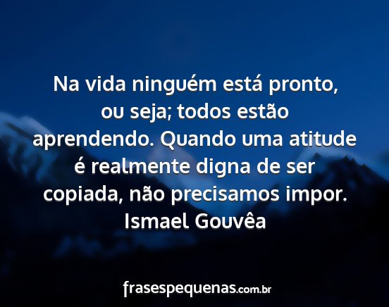 Na vida ninguém está pronto, ou seja; todos estão aprendendo. Quando uma atitude é realmente digna de ser copiada, não precisamos impor.Ismael Gouvêa