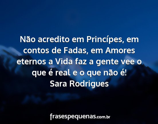 Não acredito em Princípes, em contos de Fadas, em Amores eternos a Vida faz a gente vee o que é real e o que não é!Sara Rodrigues