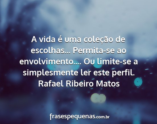 A vida é uma coleção de escolhas... Permita-se ao envolvimento.... Ou limite-se a simplesmente ler este perfil.Rafael Ribeiro Matos