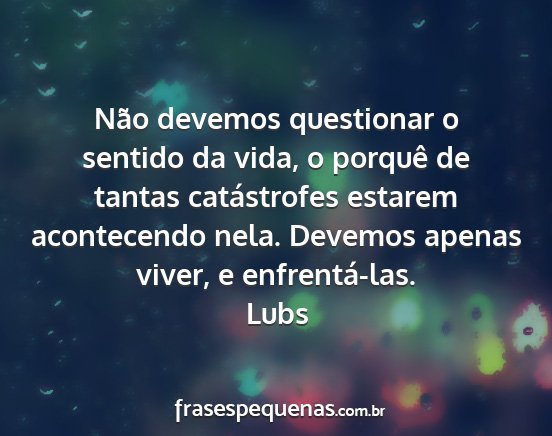 Não devemos questionar o sentido da vida, o porquê de tantas catástrofes estarem acontecendo nela. Devemos apenas viver, e enfrentá-las.Lubs
