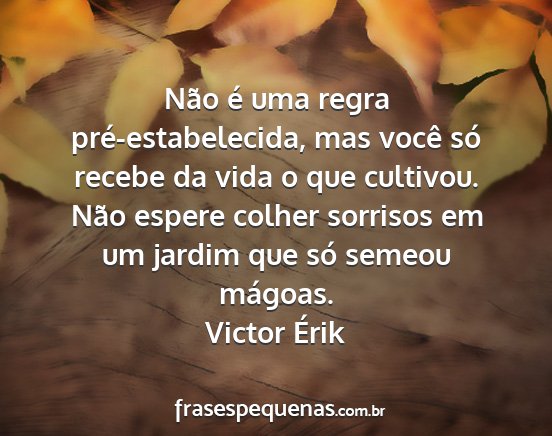 Não é uma regra pré-estabelecida, mas você só recebe da vida o que cultivou. Não espere colher sorrisos em um jardim que só semeou mágoas.Victor Érik