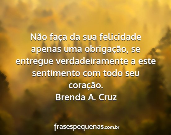 Não faça da sua felicidade apenas uma obrigação, se entregue verdadeiramente a este sentimento com todo seu coração.Brenda A. Cruz
