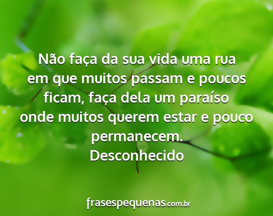 Não faça da sua vida uma rua em que muitos passam e poucos ficam, faça dela um paraíso onde muitos querem estar e pouco permanecem.Desconhecido