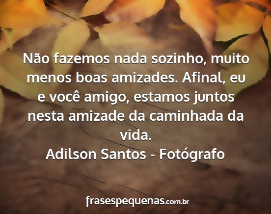 Não fazemos nada sozinho, muito menos boas amizades. Afinal, eu e você amigo, estamos juntos nesta amizade da caminhada da vida.Adilson Santos - Fotógrafo
