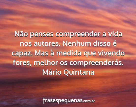 Não penses compreender a vida nos autores. Nenhum disso é capaz. Mas à medida que vivendo fores, melhor os compreenderás.Mário Quintana