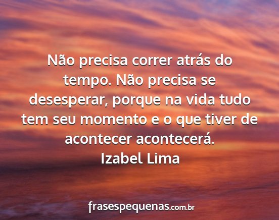 Não precisa correr atrás do tempo. Não precisa se desesperar, porque na vida tudo tem seu momento e o que tiver de acontecer acontecerá.Izabel Lima