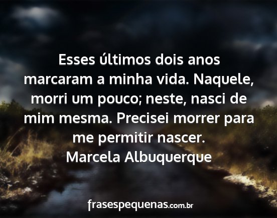 Esses últimos dois anos marcaram a minha vida. Naquele, morri um pouco; neste, nasci de mim mesma. Precisei morrer para me permitir nascer.Marcela Albuquerque
