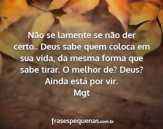 Não se lamente se não der certo.. Deus sabe quem coloca em sua vida, da mesma forma que sabe tirar. O melhor de? Deus? Ainda está por vir.Mgt
