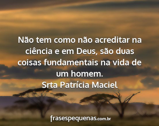 Não tem como não acreditar na ciência e em Deus, são duas coisas fundamentais na vida de um homem.Srta Patrícia Maciel