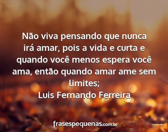 Não viva pensando que nunca irá amar, pois a vida e curta e quando você menos espera você ama, então quando amar ame sem limites;Luis Fernando Ferreira
