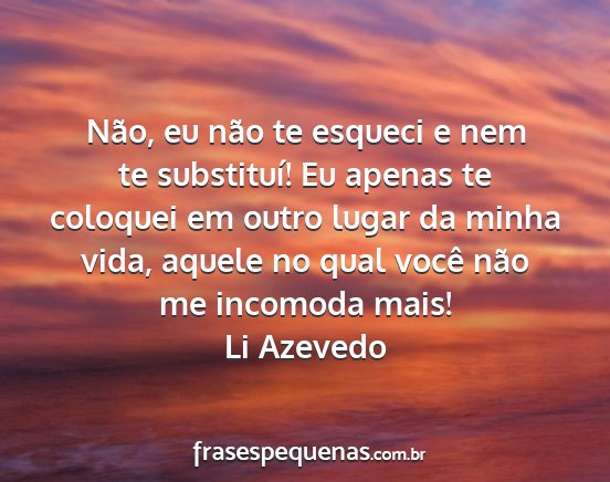 Não, eu não te esqueci e nem te substituí! Eu apenas te coloquei em outro lugar da minha vida, aquele no qual você não me incomoda mais!Li Azevedo