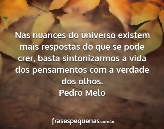 Nas nuances do universo existem mais respostas do que se pode crer, basta sintonizarmos a vida dos pensamentos com a verdade dos olhos.Pedro Melo
