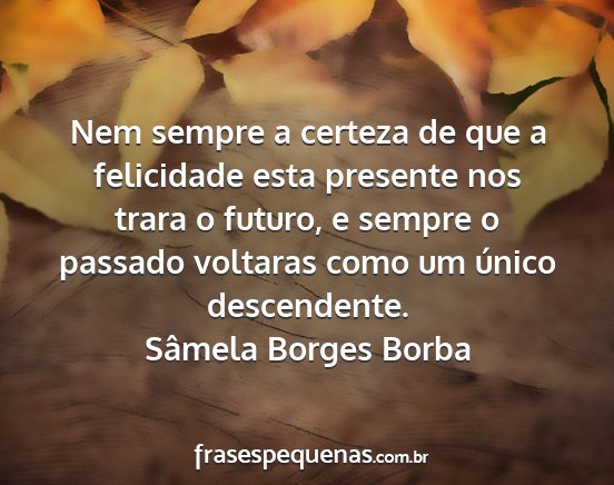 Nem sempre a certeza de que a felicidade esta presente nos trara o futuro, e sempre o passado voltaras como um único descendente.Sâmela Borges Borba