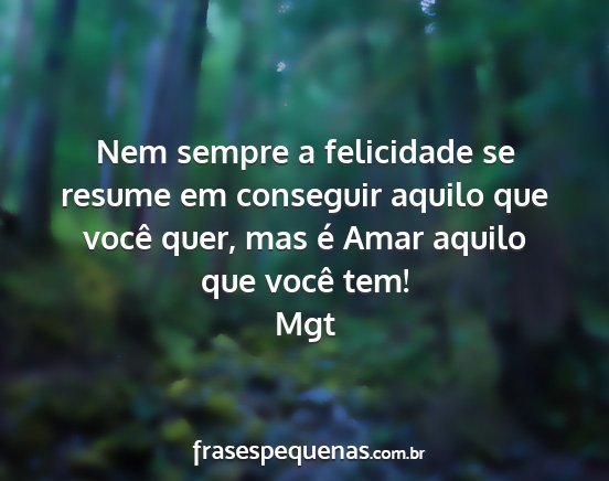 Nem sempre a felicidade se resume em conseguir aquilo que você quer, mas é Amar aquilo que você tem!Mgt