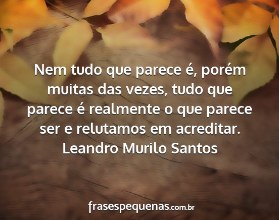 Nem tudo que parece é, porém muitas das vezes, tudo que parece é realmente o que parece ser e relutamos em acreditar.Leandro Murilo Santos