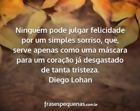 Ninguém pode julgar felicidade por um simples sorriso, que, serve apenas como uma máscara para um coração já desgastado de tanta tristeza.Diego Lohan