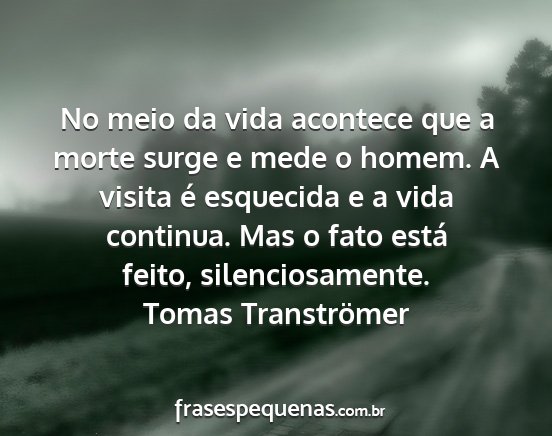 No meio da vida acontece que a morte surge e mede o homem. A visita é esquecida e a vida continua. Mas o fato está feito, silenciosamente.Tomas Tranströmer