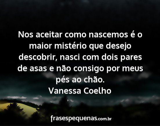 Nos aceitar como nascemos é o maior mistério que desejo descobrir, nasci com dois pares de asas e não consigo por meus pés ao chão.Vanessa Coelho