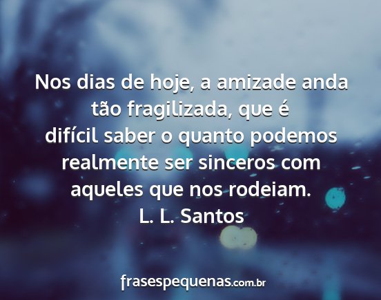 Nos dias de hoje, a amizade anda tão fragilizada, que é difícil saber o quanto podemos realmente ser sinceros com aqueles que nos rodeiam.L. L. Santos
