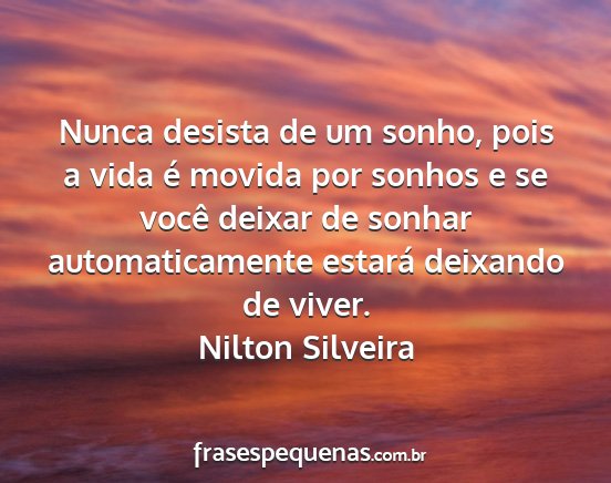 Nunca desista de um sonho, pois a vida é movida por sonhos e se você deixar de sonhar automaticamente estará deixando de viver.Nilton Silveira