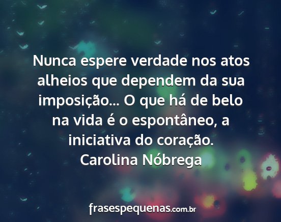 Nunca espere verdade nos atos alheios que dependem da sua imposição... O que há de belo na vida é o espontâneo, a iniciativa do coração.Carolina Nóbrega