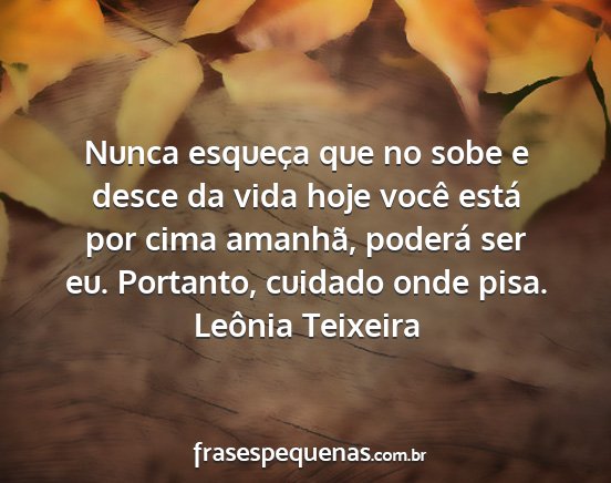 Nunca esqueça que no sobe e desce da vida hoje você está por cima amanhã, poderá ser eu. Portanto, cuidado onde pisa.Leônia Teixeira