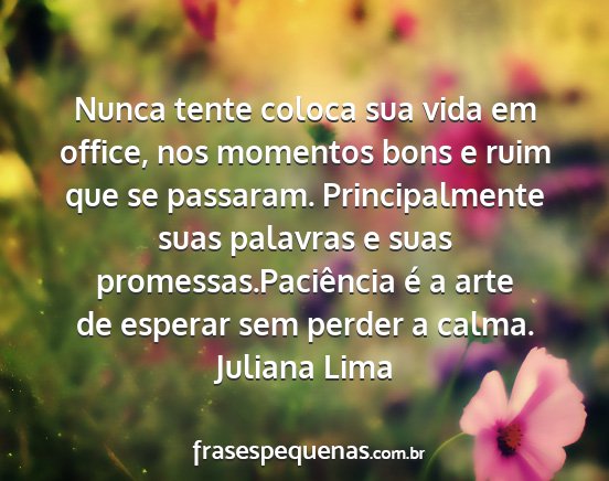 Nunca tente coloca sua vida em office, nos momentos bons e ruim que se passaram. Principalmente suas palavras e suas promessas.Paciência é a arte de esperar sem perder a calma.Juliana Lima