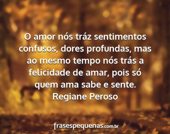 O amor nós tráz sentimentos confusos, dores profundas, mas ao mesmo tempo nós trás a felicidade de amar, pois só quem ama sabe e sente.Regiane Peroso