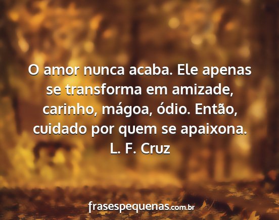 O amor nunca acaba. Ele apenas se transforma em amizade, carinho, mágoa, ódio. Então, cuidado por quem se apaixona.L. F. Cruz