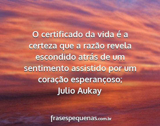 O certificado da vida é a certeza que a razão revela escondido atrás de um sentimento assistido por um coração esperançoso;Julio Aukay