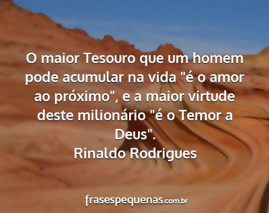 O maior Tesouro que um homem pode acumular na vida "é o amor ao próximo", e a maior virtude deste milionário "é o Temor a Deus".Rinaldo Rodrigues