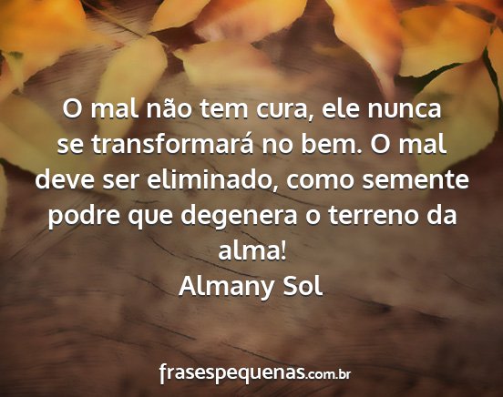 O mal não tem cura, ele nunca se transformará no bem. O mal deve ser eliminado, como semente podre que degenera o terreno da alma!Almany Sol