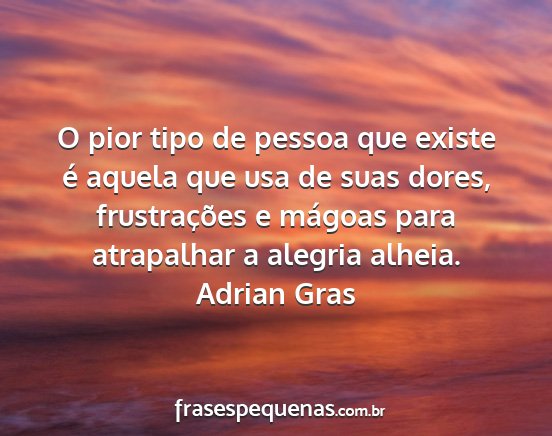 O pior tipo de pessoa que existe é aquela que usa de suas dores, frustrações e mágoas para atrapalhar a alegria alheia.Adrian Gras