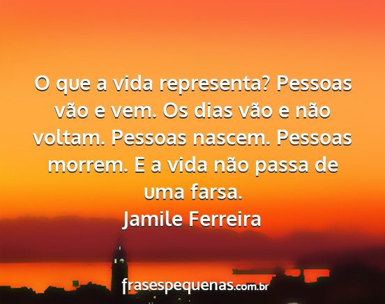 O que a vida representa? Pessoas vão e vem. Os dias vão e não voltam. Pessoas nascem. Pessoas morrem. E a vida não passa de uma farsa.Jamile Ferreira