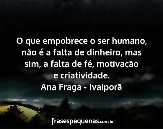 O que empobrece o ser humano, não é a falta de dinheiro, mas sim, a falta de fé, motivação e criatividade.Ana Fraga - Ivaiporã