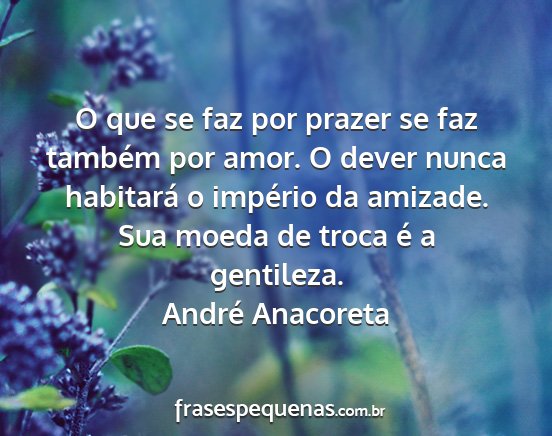O que se faz por prazer se faz também por amor. O dever nunca habitará o império da amizade. Sua moeda de troca é a gentileza.André Anacoreta