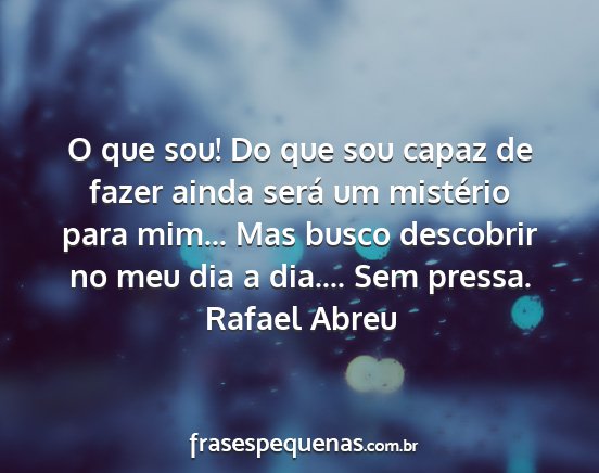 O que sou! Do que sou capaz de fazer ainda será um mistério para mim... Mas busco descobrir no meu dia a dia.... Sem pressa.Rafael Abreu