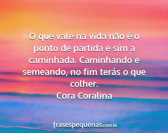 O que vale na vida não é o ponto de partida e sim a caminhada. Caminhando e semeando, no fim terás o que colher.Cora Coralina