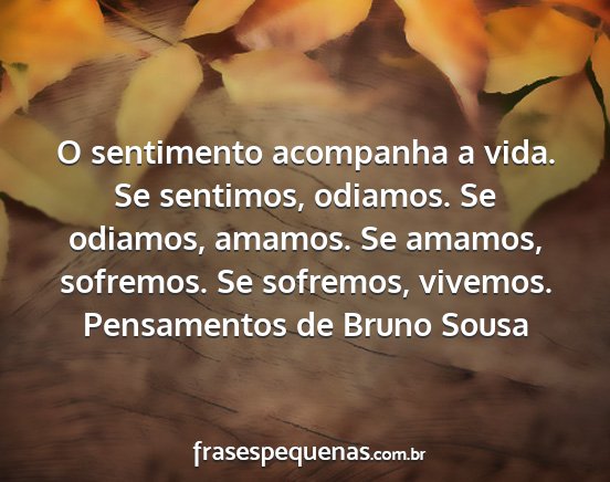 O sentimento acompanha a vida. Se sentimos, odiamos. Se odiamos, amamos. Se amamos, sofremos. Se sofremos, vivemos.Pensamentos de Bruno Sousa
