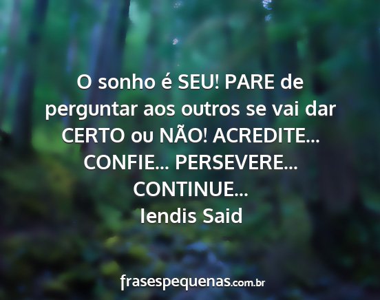 O sonho é SEU! PARE de perguntar aos outros se vai dar CERTO ou NÃO! ACREDITE... CONFIE... PERSEVERE... CONTINUE...Iendis Said