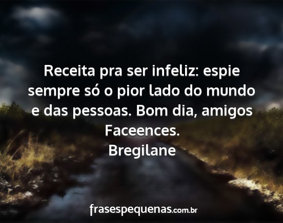 Receita pra ser infeliz: espie sempre só o pior lado do mundo e das pessoas. Bom dia, amigos Faceences.Bregilane