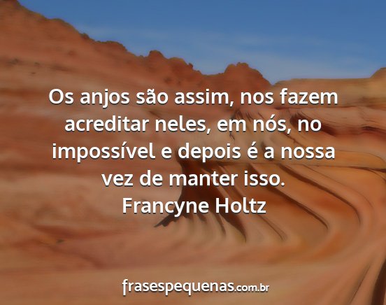 Os anjos são assim, nos fazem acreditar neles, em nós, no impossível e depois é a nossa vez de manter isso.Francyne Holtz